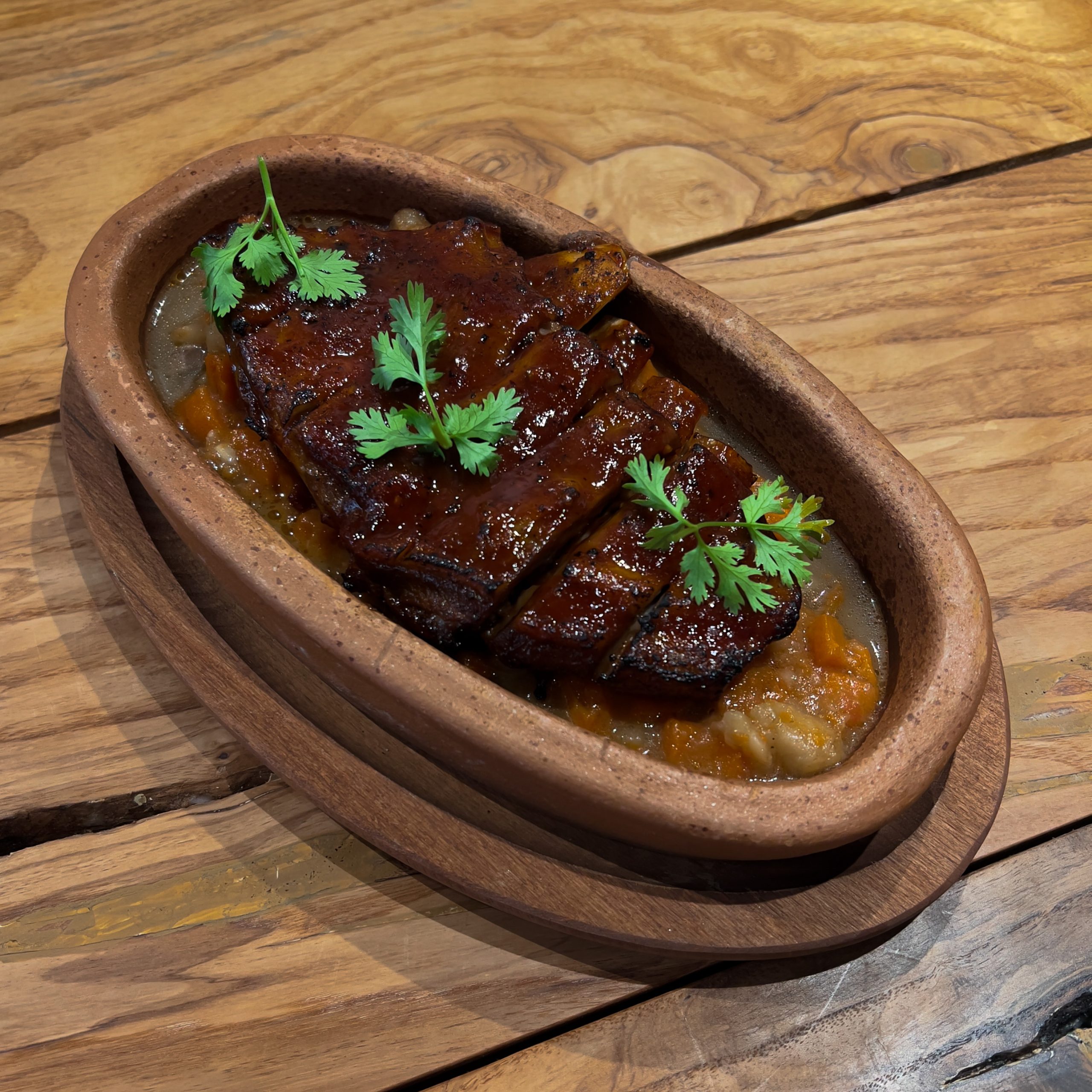 YOY boasts a multisensory culinary journey where diners can discover scrumptious dishes prepared through fire cooking. When you arrive at the venue, you’re immediately greeted with its warm indoor ambience and a 13-meter-long wooden table in the centre of the indoor space adorned with mismatched traditional chairs, handmade ceramics, and a chandelier in the form of the stork’s nest, the bird symbolizing love for the native country. During our quick tour, we further made our way to the alfresco terrace which offered picturesque views of the world’s tallest fountain and the Atlantis.