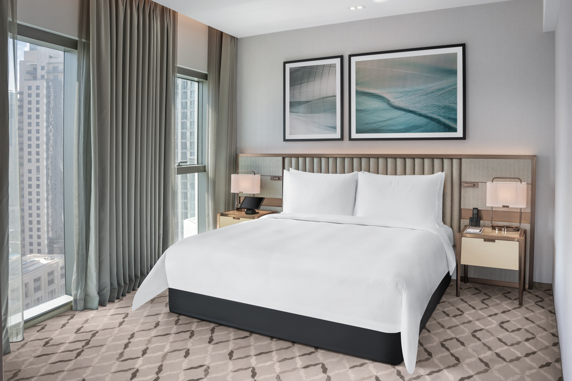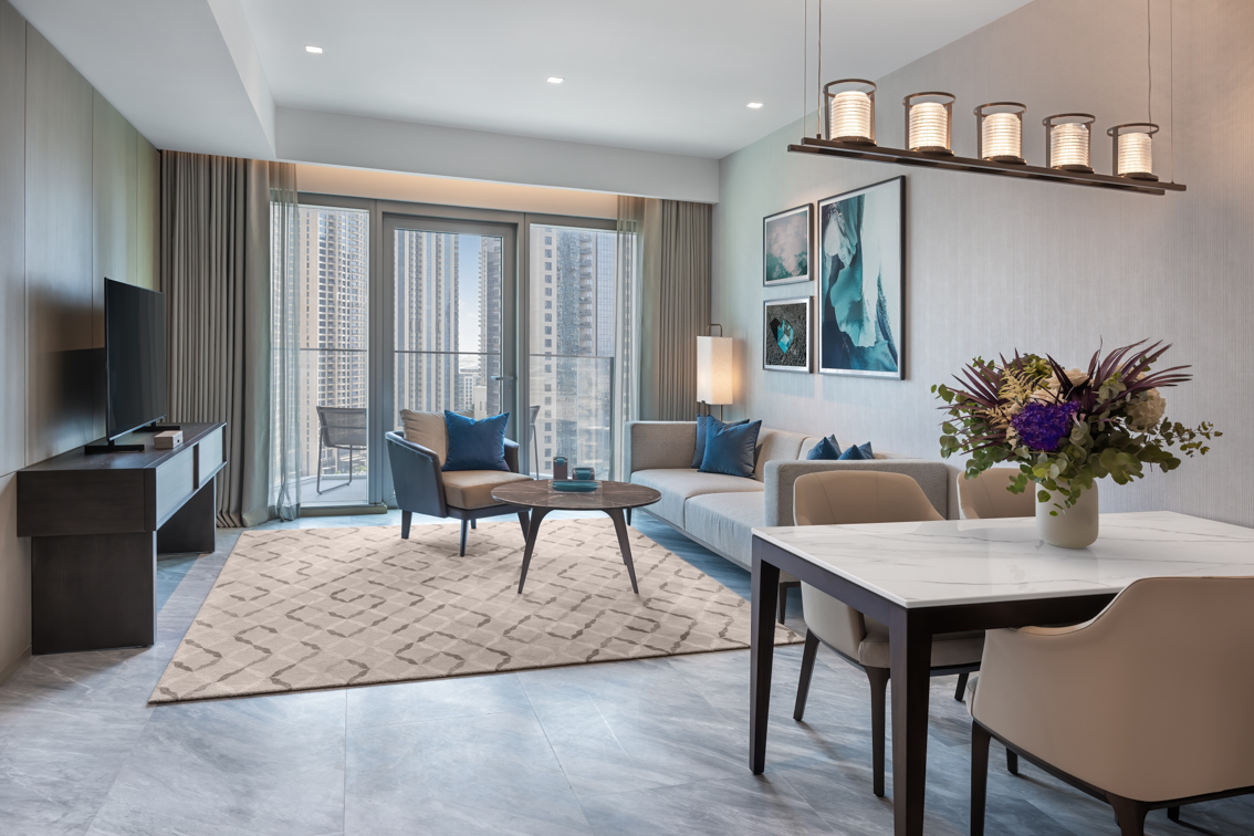 The waterfront destination is home to 223 rooms and suites including options such as Deluxe City View Room King, Premier Creek Room with Balcony, Club Creek View Room, and Skyline Suite with Balcony, to name a few. The Executive Suite with Balcony offers an exceptional and spacious area featuring an expansive living area with a four-seater dining table, blue-themed interiors complementing the outdoor view, a quaint sofa area, a guest bathroom, and a balcony with unrivalled views of the Dubai skyline and creek.