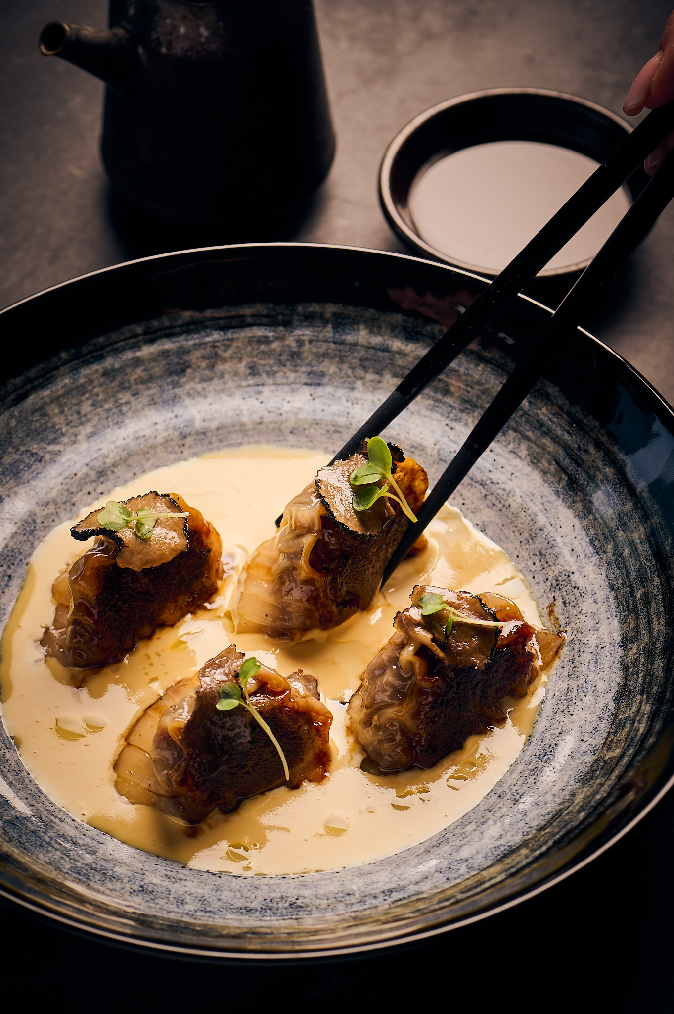 For dinner, we headed to Ronin perched on the ninth floor. The restaurant’s design, with its striking samurai-inspired murals, set an edgy tone. The menu, led by Chef Sin Keun Choi, offered an array of creative Japanese dishes. We began with the Cucumber Salad, a refreshing mix of soy honey, shiso, and apple yuzu, before moving on to the Golden Nugget – a playful twist on chicken kara-age, topped with caviar and lime cream cheese. The Wagyu truffle gyoza is a showstopper, with tender beef inside and a truffle ponzu butter sauce that adds a rich, savoury depth.