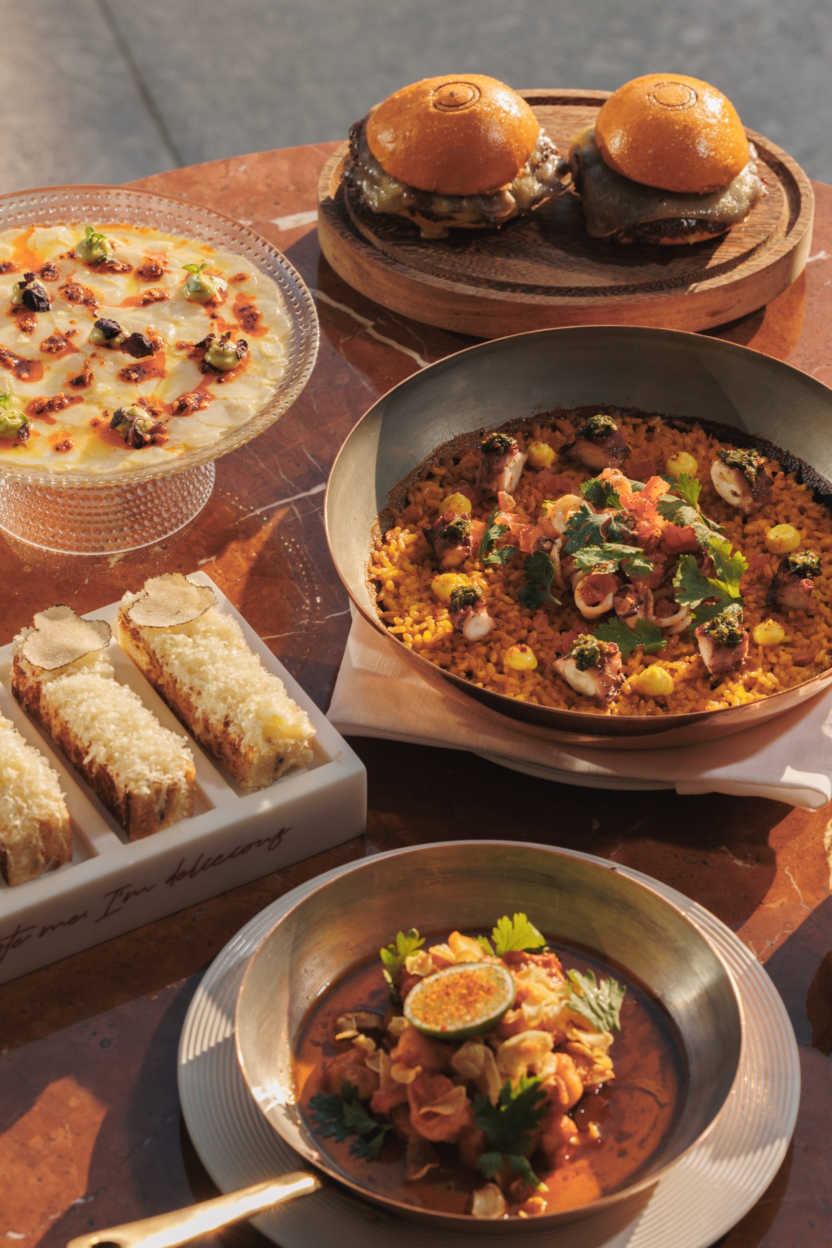We visited the Commodore Club at The Residence for lunch ahead of check-in. The space is calm with curved booths and soft lighting. Cream tones and gold accents are balanced by natural light from the large windows, and the overall feel is laid-back. The menu focuses on simple, comfort dishes. The Prawns piri piri are served in a spiced tomato sauce with crisp garlic and toasted bread, bold in flavour without being too heavy. The Chicken corn salad is light and balanced, with creamy avocado, sweet corn, pickled onion and a sharp white balsamic dressing. The Goat cheese salad is richer, with caramelised walnuts and warm toast topped with tangy cheese. For mains, the Octopus and calamari paella arrives with saffron rice, coriander and a spoonful of aioli that adds just enough sharpness. The Parmigiana is layered with soft slices of eggplant, baked with tomato and cheese until the edges start to brown. We ended with a Tiramisu latte served alongside ladyfingers, plus a Matcha version that was not too sweet and provided a clean finish to the meal.
