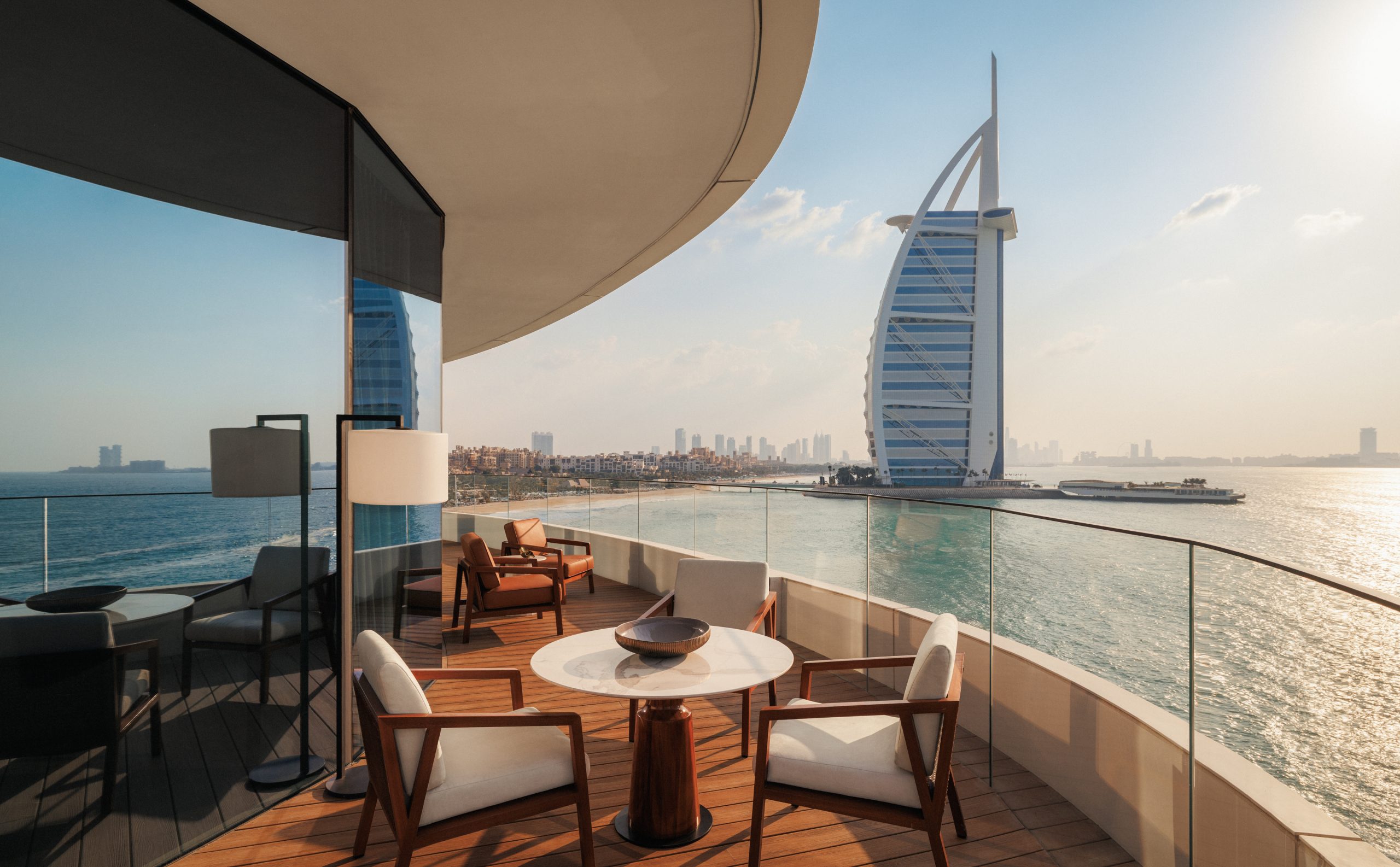 Though the property spans over 300 rooms, 86 suites and 82 residences, it’s designed to feel intimate, with layered scents, quiet lobby corners and thoughtful landscaping. We checked into the Ocean Deluxe Suite and were met with one of the best views in the city: the Burj Al Arab sitting just off centre, framed by the terrace and a wide stretch of sea. The terrace is large enough to actually use. We spent the morning there with coffee, watching the light shift over the water, and evenings letting the breeze roll in off the Gulf.