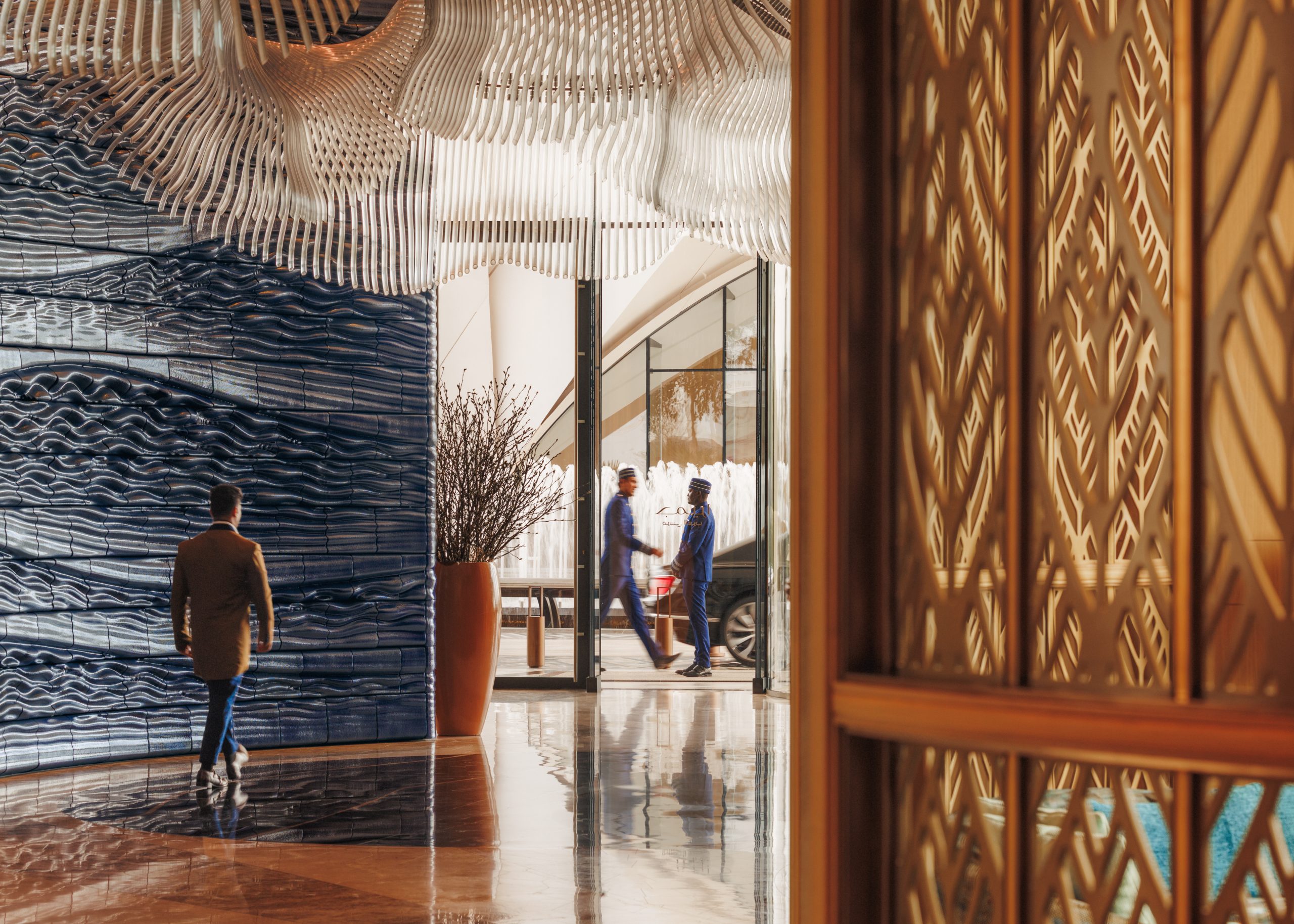 Designed by Shaun Killa, the architect behind the Museum of the Future and Dubai Opera, the hotel takes its shape from the sleek design of a superyacht, with flowing curves that appear to glide across the coastline. From the entrance archway that perfectly frames the Burj Al Arab to the 3,000-tonne sculptural canopy, the experience is immersive rather than overwhelming, with the building revealing itself at every step.