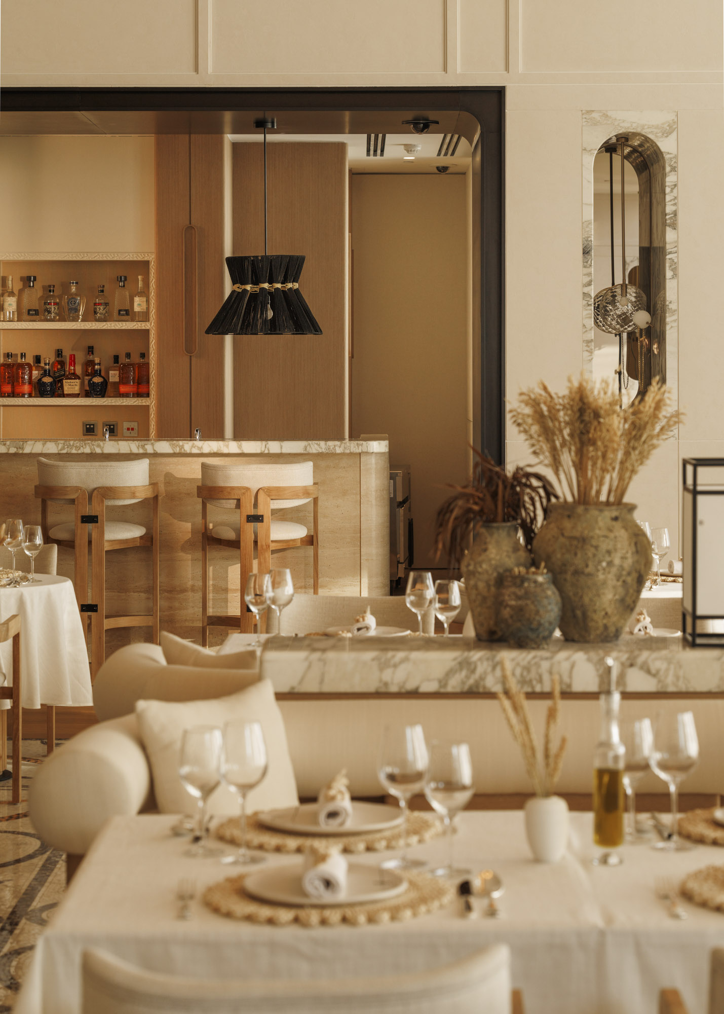 Inside, the suite is all soft edges and clean lines with a calming palette of cream, sand, and pale stone, broken up by dark wood, bronze details, and the occasional splash of ocean blue. The layout flows naturally, beginning with a spacious living area featuring a deep, cushioned sofa, dining table, and a minibar thoughtfully stocked with local treats. There’s also 24/7 butler assistance available, adding to the overall comfort. The separate bedroom does not feel boxed in and includes a spacious walk-in wardrobe perfect for unpacking and organising, a Dyson hairdryer, and a well-appointed work desk.
