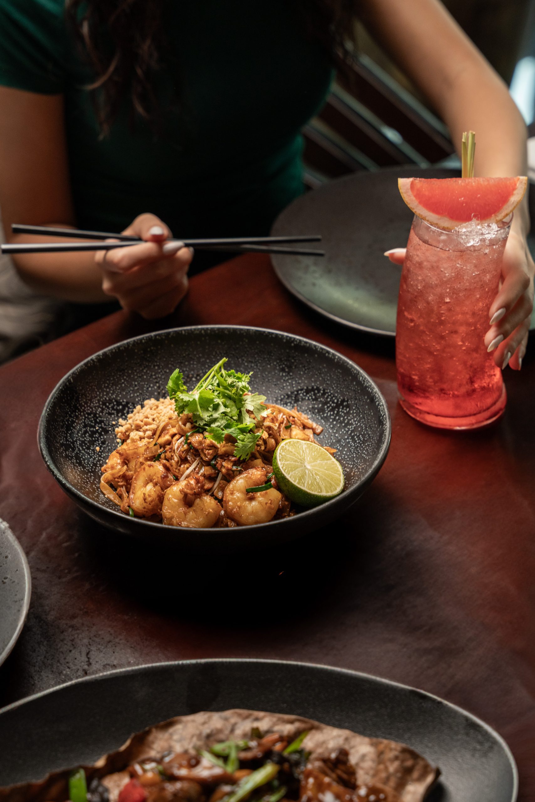 For the main course, the Tiger prawn tempura roll impressed with black tiger shrimp, asparagus, and tempura crumbs, topped with wasabi mayo and sesame seeds. The Prawns pad Thai presented a traditional stir-fried rice noodle dish, featuring scrambled egg, bean sprouts, fish sauce, and pad Thai sauce, garnished with coriander leaves, lime, and crushed roasted peanuts, showcasing a perfect balance of tangy, sweet, and savoury elements. The meal concluded with a delightful Mango crème brûlée, enriched with yuzu gel, coconut ice cream, and roasted mango.