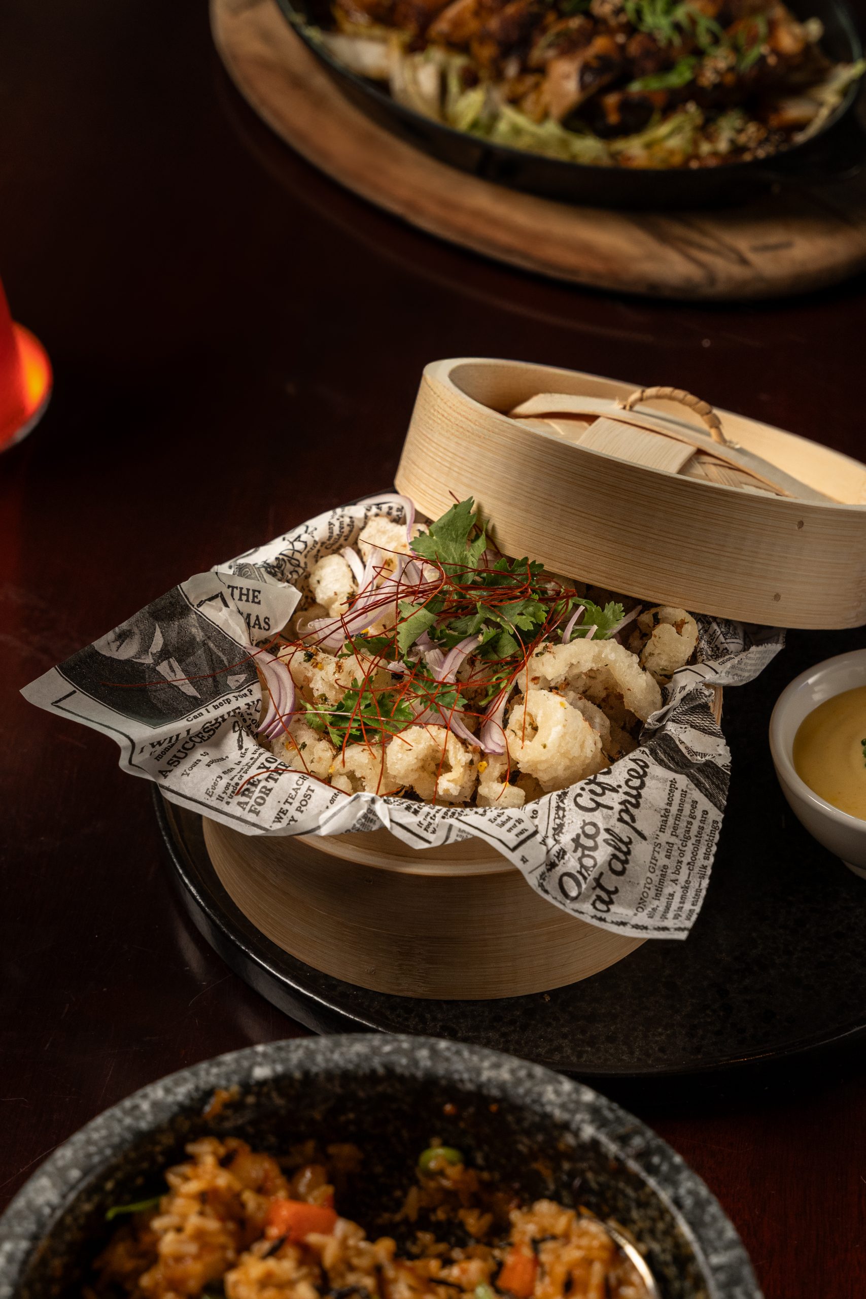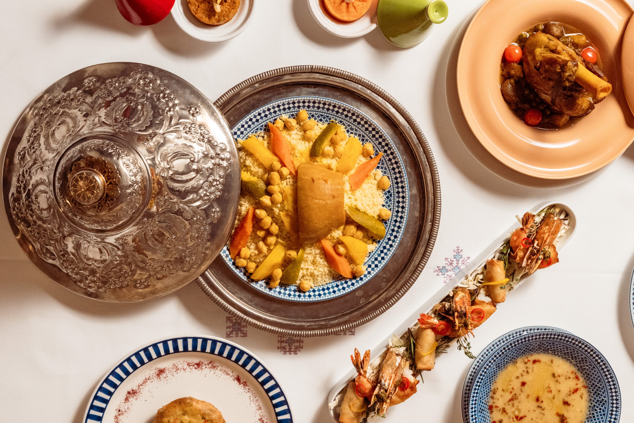 As evening descended, we were transported to Morocco at Tagine, a restaurant where the atmosphere is as captivating as the cuisine. Here, warm lighting and intricate design set the stage for a meal that began with a series of bites: crispy Cigar eggplant, Fried gambas marinated in charmoula, Serpentine of vegetables drizzled with sweet kezbour coulis, Goat cheese briouate, Coussin de kofta & red onion lamb, Chicken roll, and plenty more.