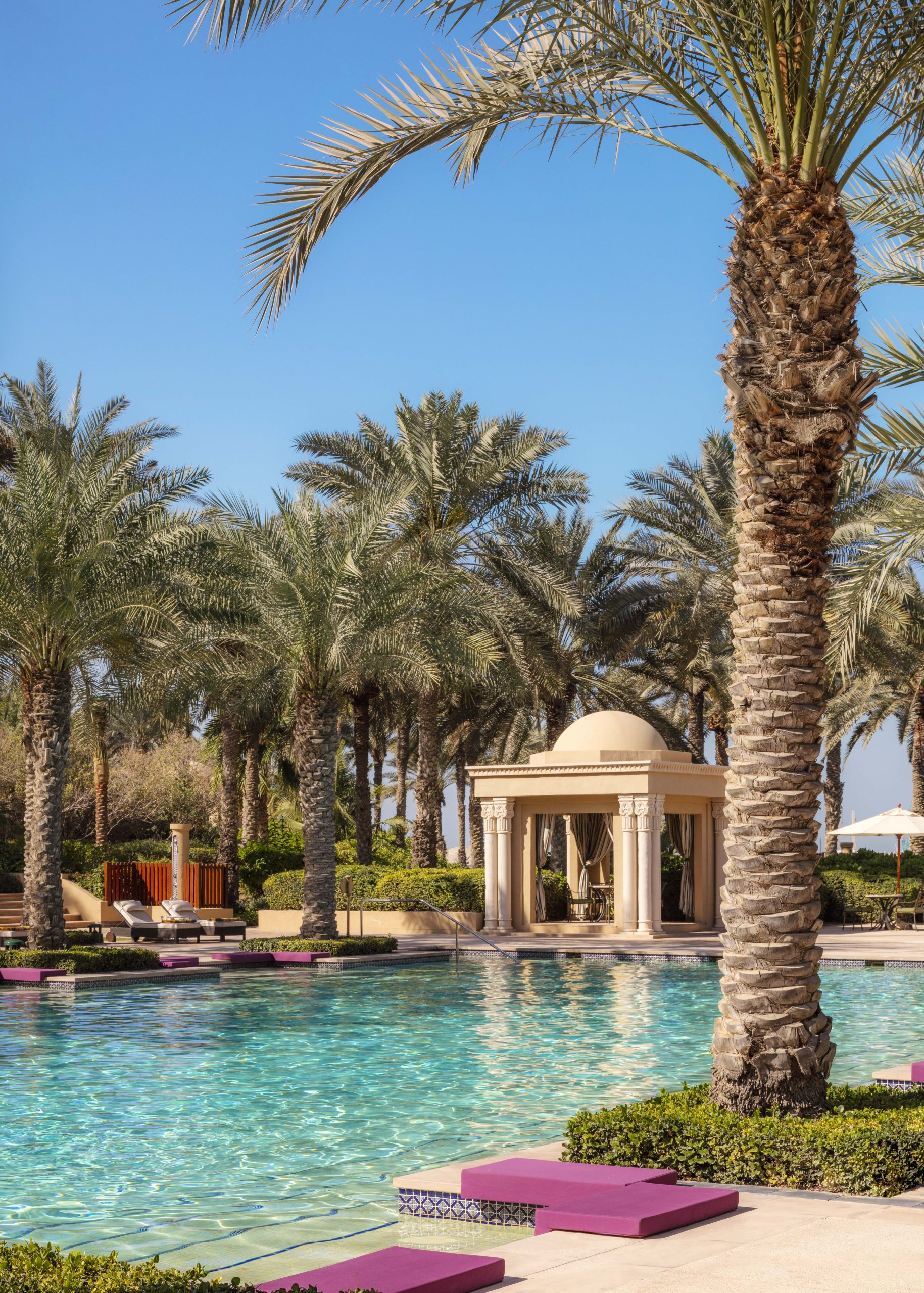 Conveniently located between the dynamic Media City and the iconic Palm Islands, the One&Only Royal Mirage offers guests the best of both worlds. The resort’s three distinct areas—The Palace, The Residence & Spa, and The Arabian Court—cater to every taste, whether you’re seeking opulent grandeur, intimate luxury, family-friendly comfort, or a romantic retreat. The desert-inspired sandstone architecture pays homage to Bedouin traditions, while the dramatic gold camel riders at The Palace entrance add a touch of Dubai’s flamboyant flair. For a more subdued experience, The Residence & Spa offers a retreat within a retreat, with its winding corridors and intricate mosaics evoking an Arabian Nights fantasy (though a flying carpet is sadly not included).
