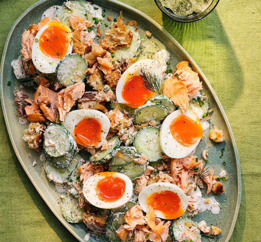 Put cucumber centre stage in this smoked trout salad with eggs and sourdough croutons. It’s a great way to showcase homegrown cucumbers a little differently.