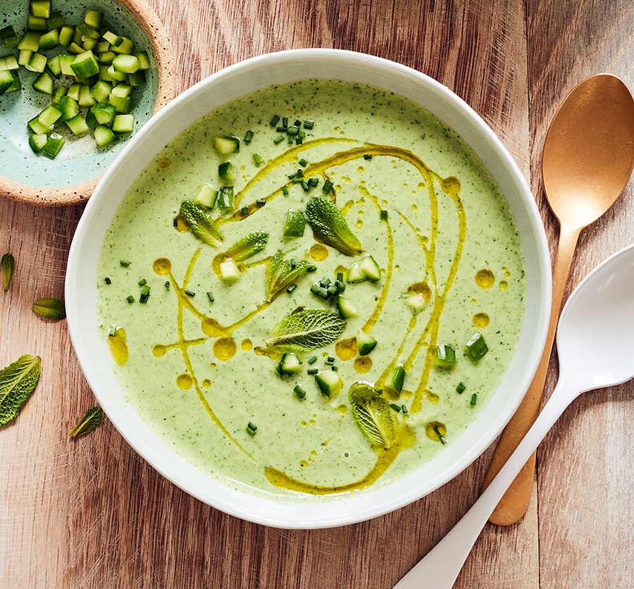 The refreshing cucumber soup is served cold, so it will go down well on a summer’s day. Ladle it into bowls for a smaller gathering, or pour into small cups for an amuse-bouche.