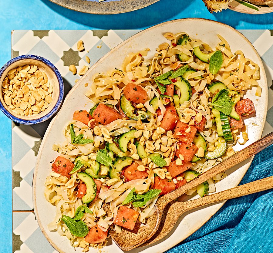 Up your salad game with this noodle, cucumber and watermelon salad in a punchy dressing, topped with peanuts. It works as a standalone dish or summer barbecue side.